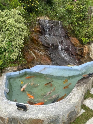 Lago con cascada y pescados